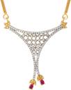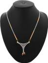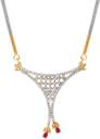 This Tanmaniya is studded with zircon stones which look alike real diamonds. It is also studded with semi precious stones and plated with 18K yellow gold and rhodium for long lasting shine. This beautiful mangalsutra is a perfect fit for any party or special ocassion. It's graceful design compliments with any ething or western outfit.