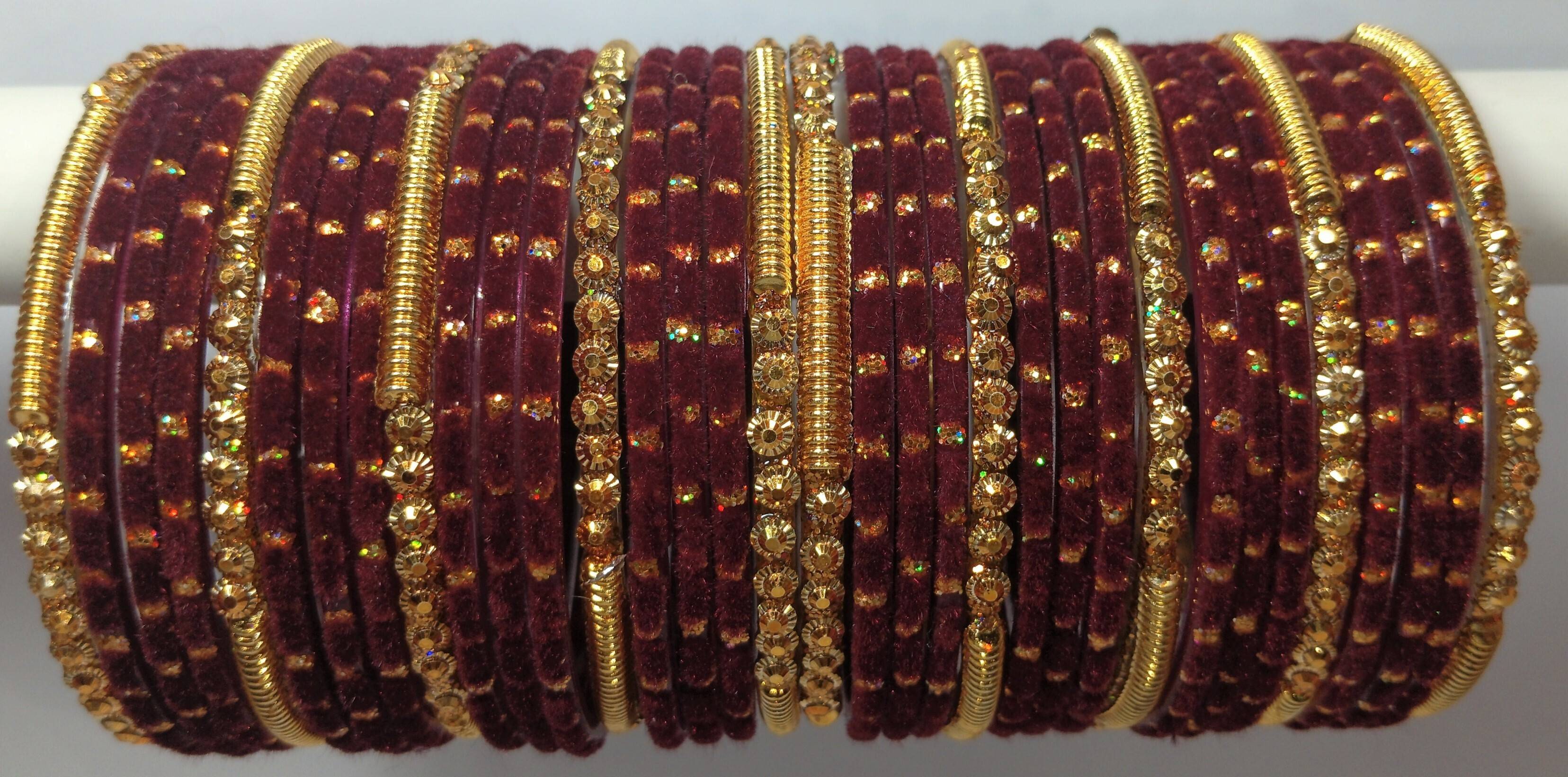 Stylish Traditional Glass Bangle Set with Golden Beads & Polka Dots Studded Velvet Bangles Set For Women and Girls-Set of 34