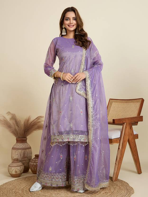 Women Silk Blend Kurta Sharara Dupatta Set