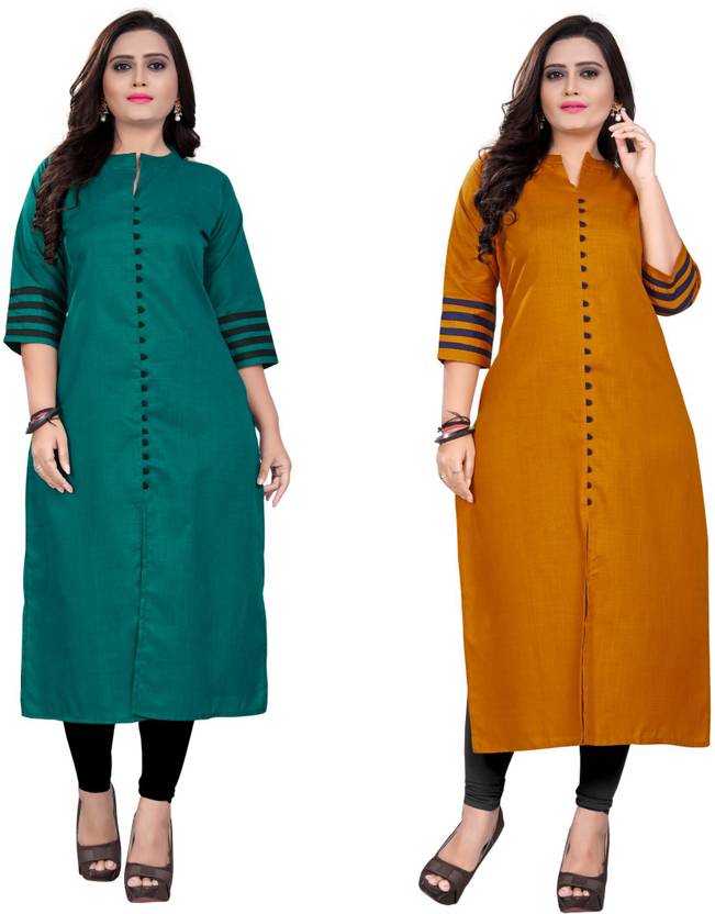 amar tex Pack of 2 Women Solid Cotton Blend Frontslit Kurta  (Dark Green, Yellow)