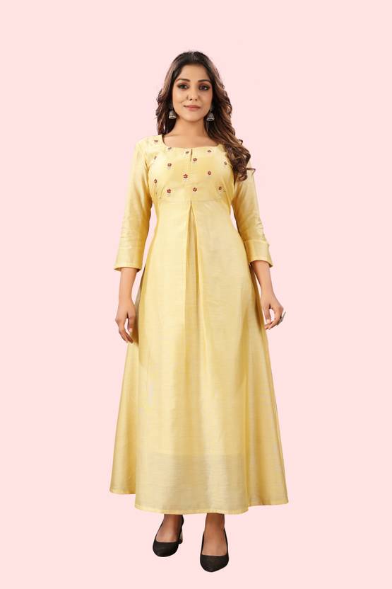Women Embroidered Chanderi A-line Kurta (Yellow)