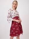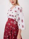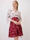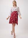 Introducing the AmarAsha Women's Red Delta Lycra Dress, a stunning blend of style and comfort. This knee-length dress features a vibrant geometric print on soft, stretchy Lycra fabric, ensuring a flattering fit. The V-neck design and 3/4 bell sleeves add a touch of elegance, while the drop shoulder sleeves and pleats on the yoke and bottom enhance its chic appeal. The A-line silhouette is accentuated by a unique layering detail, overlapped with an umbrella shape, and tied with a buckle on the side waist for a perfect fit. A convenient back zip completes this must-have dress for any occasion.