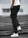 Cargo style with multiple flap pockets for utility and style, Black strap detailing on side pockets for a modern look, Elastic waistband with drawstring for a comfortable fit, Elastic ankle cuffs for a sporty jogger style