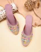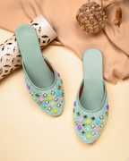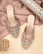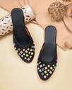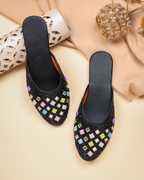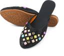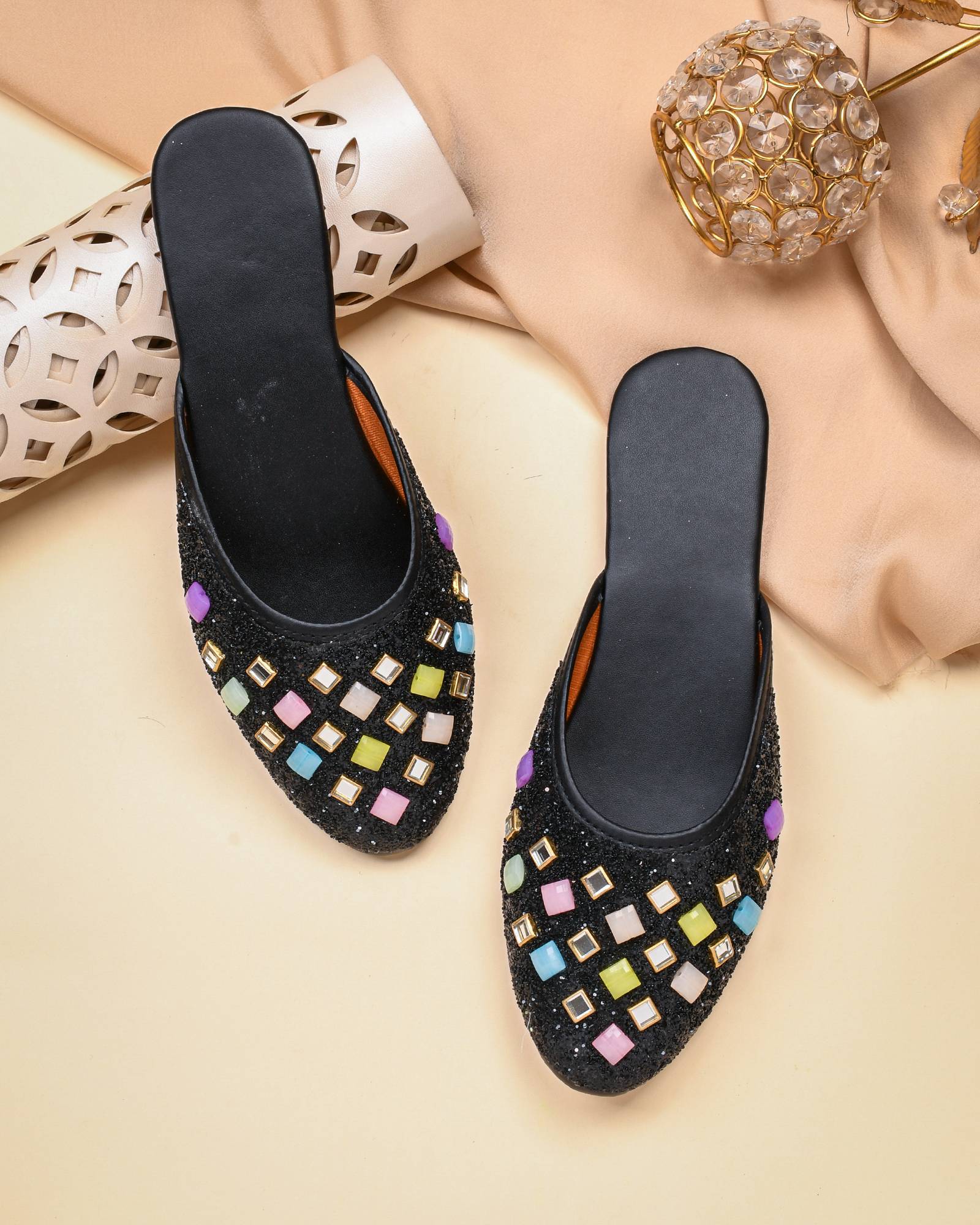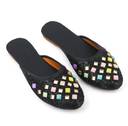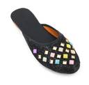 These black flat mules feature a sparkling glitter finish on the upper, adding a touch of glamour. The front is intricately decorated with an array of square-shaped, multi-colored embellishments in vibrant pink, blue, green, yellow, and purple hues, each framed in gold. The interior boasts a contrasting orange lining, while the black footbed provides comfort. The durable light brown outsole is embossed with a delicate floral pattern, ensuring both style and grip. These versatile mules are perfect for complementing ethnic attire like kurtis, salwar suits, and lehengas, or for adding a chic touch to casual ensembles such as jeans, skirts, and dresses.
