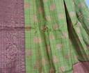 Pesta green and yellow dual tone zari chekered soft silk saree with zari maple leaf buta and magenta border.
