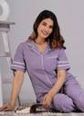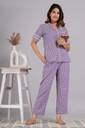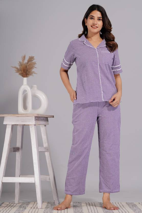 Sleeve Type: Half Sleeve | Neck Type: Notched Collared Night Suit set for Women Stylish Material: 100% Cotton | Pattern: Checkered printed night suit for women cotton Two piece Nightwear: Printed Shirt + Pyjama (Pajama set for women) Purpose: night dress for women cotton, sleepwear - loungewear - home wear for women Fit Type: Regular (Relaxed) Fit. Purple night suit for ladies. Checkered Printed pyjama set for women. Night suits for ladies cotton. Night dress for women and shirts. Night suit cotton for women.