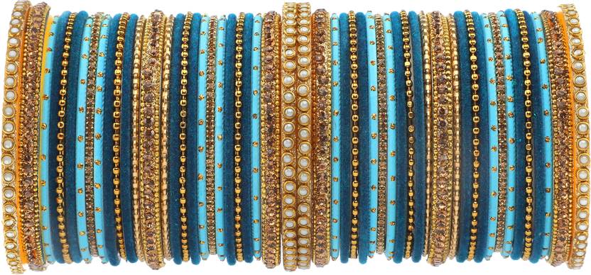 PRODUCT DETAILS: - This Exclusive bangle set is Blue & Surf in color having Golden Colored zircon Gemstone & Pearl studded Kada with velvet and Embellished bangles in middle giving you an elegant persona. This Double Colored bangle set is available in pack of 50 bangles which offers you a more complete ethnic and charming look. SIZES: - This bangle set is vaialble in three sizes -2.2/2.4/2.6/2.8. QUALITY & PRICE: - We are always take stringent measures on product quality by maintaing its price. We assure you that our products are supreme in quality that is non-allergic and Budget friendly too. IDEAL GIFT: - Gifts are meant to express love and affection which can brings smile on your loved ones face. Bangles are more than the ornaments and thus perfect gift for your wife, sister, daughter, mother. OCCASION TO WEAR : - These bangles are shimmering having glitter/glossy finish and you can wear them in weddings, festivals, parties, karwachauth, diwali, raksha bandhan etc. ABOUT AMIKA: - We aim at reforming the fashion trends at reasonable cost in India with our exclusive bangles collection. We are focussed to offer excellent customer experience that can make your everday special. JEWELLERY CARE: - Its always necessary to take care of your jewellery accessories for enjoying them longer, so avoid there contact with perfumes and sprays, Always store them in moist free and dirt free box, Use soft cloth to clean them.