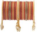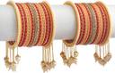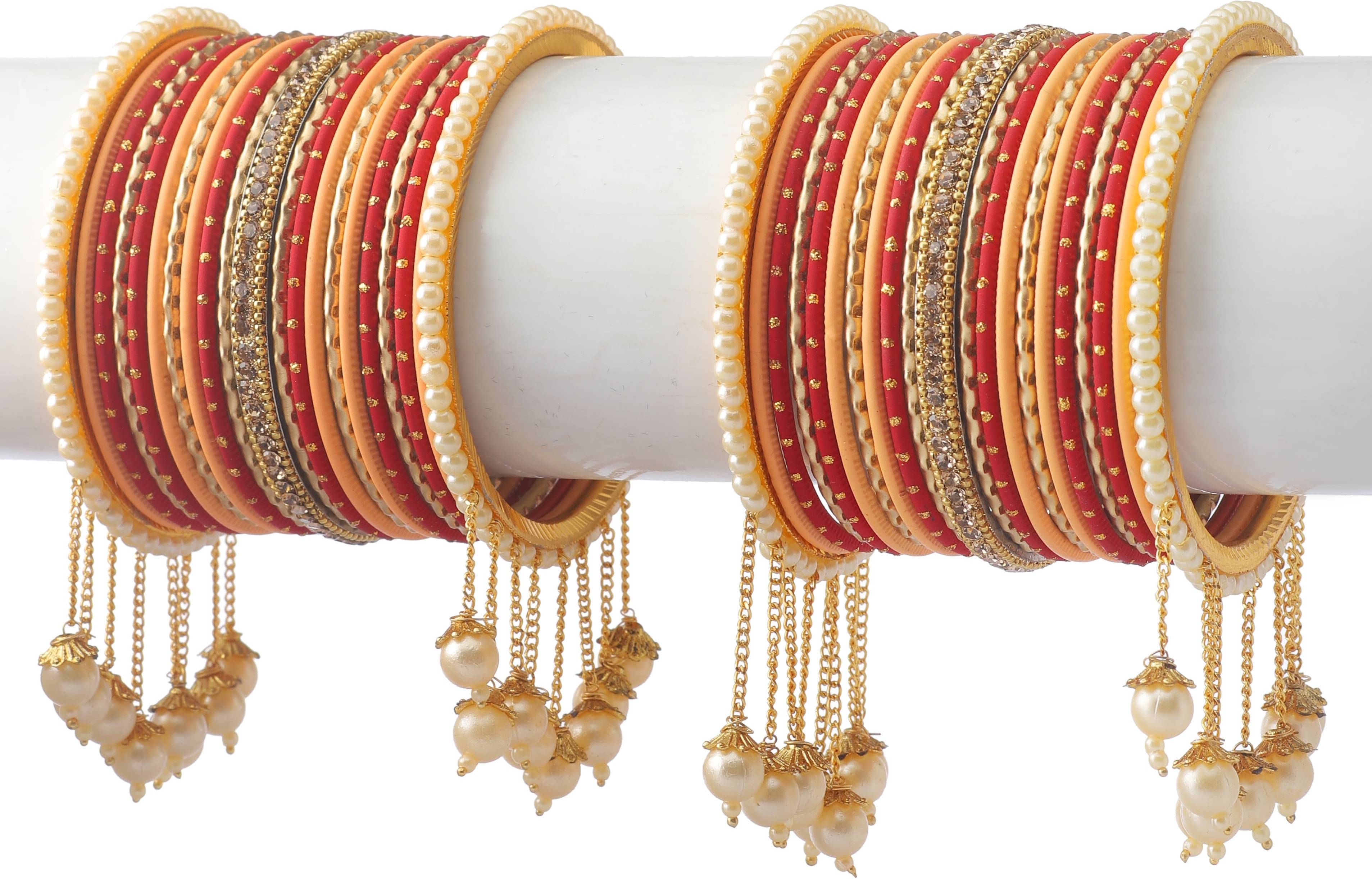 PRODUCT DETAILS: - This elegant charming bangle set is red & peach in color having white round shaped pearl & Zircon gemstone studded Kada with velvet in middle giving you a gorgeous Look. This bangle set is available in pack of 42 bangles which is all set to make you feel ethnicity. SIZES: - This bangle set is available in four sizes - 2.2/2.4/2.6/2.8. QUALITY & PRICE: - We are always take stringent measures on product quality by maintaing its price. We assure you that our products are supreme in quality that is non-allergic and Budget friendly too. IDEAL GIFT: - Gifts are meant to express love and affection which can brings smile on your loved ones face. Bangles are more than the ornaments and thus perfect gift for your wife, sister, daughter, mother. OCCASION TO WEAR : - These bangles are shimmering having glitter/glossy finish and you can wear them in weddings, festivals, parties, karwachauth, diwali, raksha bandhan etc. ABOUT AMIKA: - We aim at reforming the fashion trends at reasonable cost in India with our exclusive bangles collection. We are focussed to offer excellent customer experience that can make your everday special. JEWELLERY CARE: - Its always necessary to take care of your jewellery accessories for enjoying them longer, so avoid there contact with perfumes and sprays, Always store them in moist free and dirt free box, Use soft cloth to clean them.