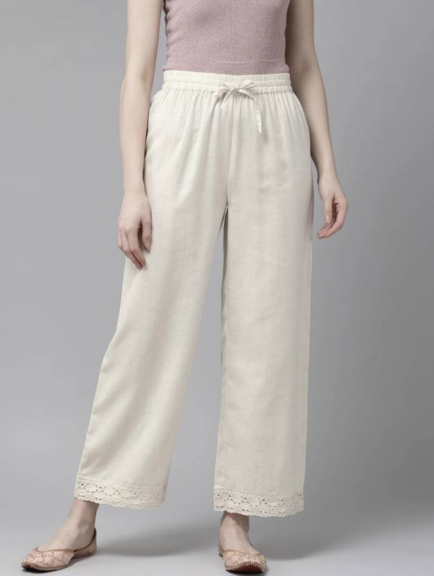 An amazing range of womens fusion wear in soft and solid colors that looks perfect for regular wear. With beautiful designs and patterns. These apparels are very stylish and comfortable too. Get rid of the regular look this season wearing Palazzo by Styllow. This Straight Solid Palazzo from Styllow exhibits qureshia lace along with drawstring and elastic closure. Tailored from Cotton Flax. Product Length: 38 Inches.