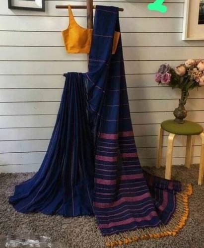 Checkered Tant Cotton Blend Saree (Dark Blue)