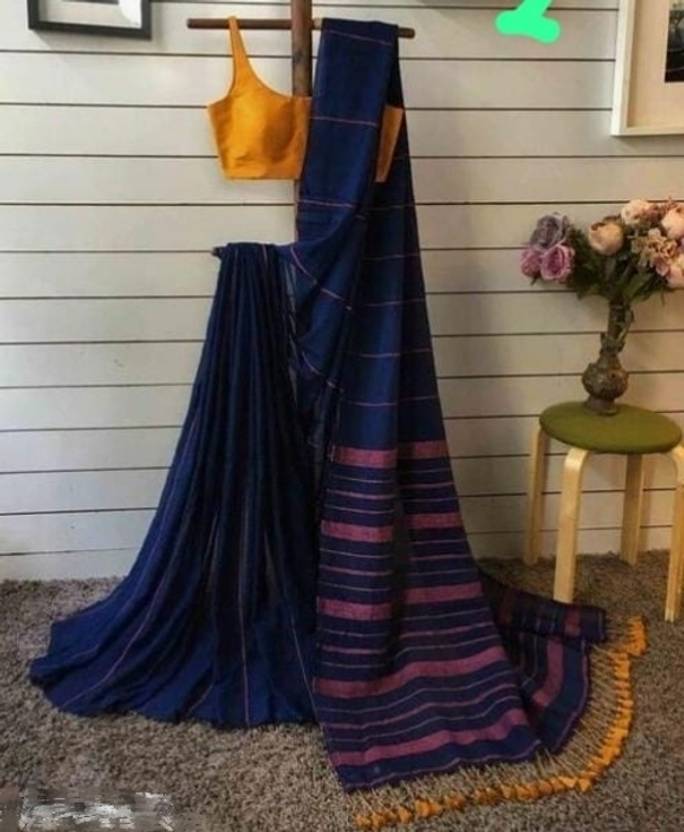 amitcollection Checkered Tant Cotton Blend Saree (Dark Blue)