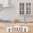 Elevate your kitchen storage with our PC Puri Dabba Set, crafted from premium quality stainless steel with a stunning mirror finish. These dabbas are designed not only for durability and long-term use but also to add a touch of elegance to your kitchen shelves. Each dabba in the set features a secure-fitting lid with a beautifully embossed design, ensuring that your stored items remain fresh and protected. The sturdy, rust-resistant construction makes them ideal for daily use, and the polished look complements both traditional and modern kitchens. We can store almost every item in this dabba - Fresh puri, Snacks like namkeen, chips, biscuits, and dry fruits, Spices and masalas in bulk quantities Dry items like tea leaves, coffee powder, and baking essentials.