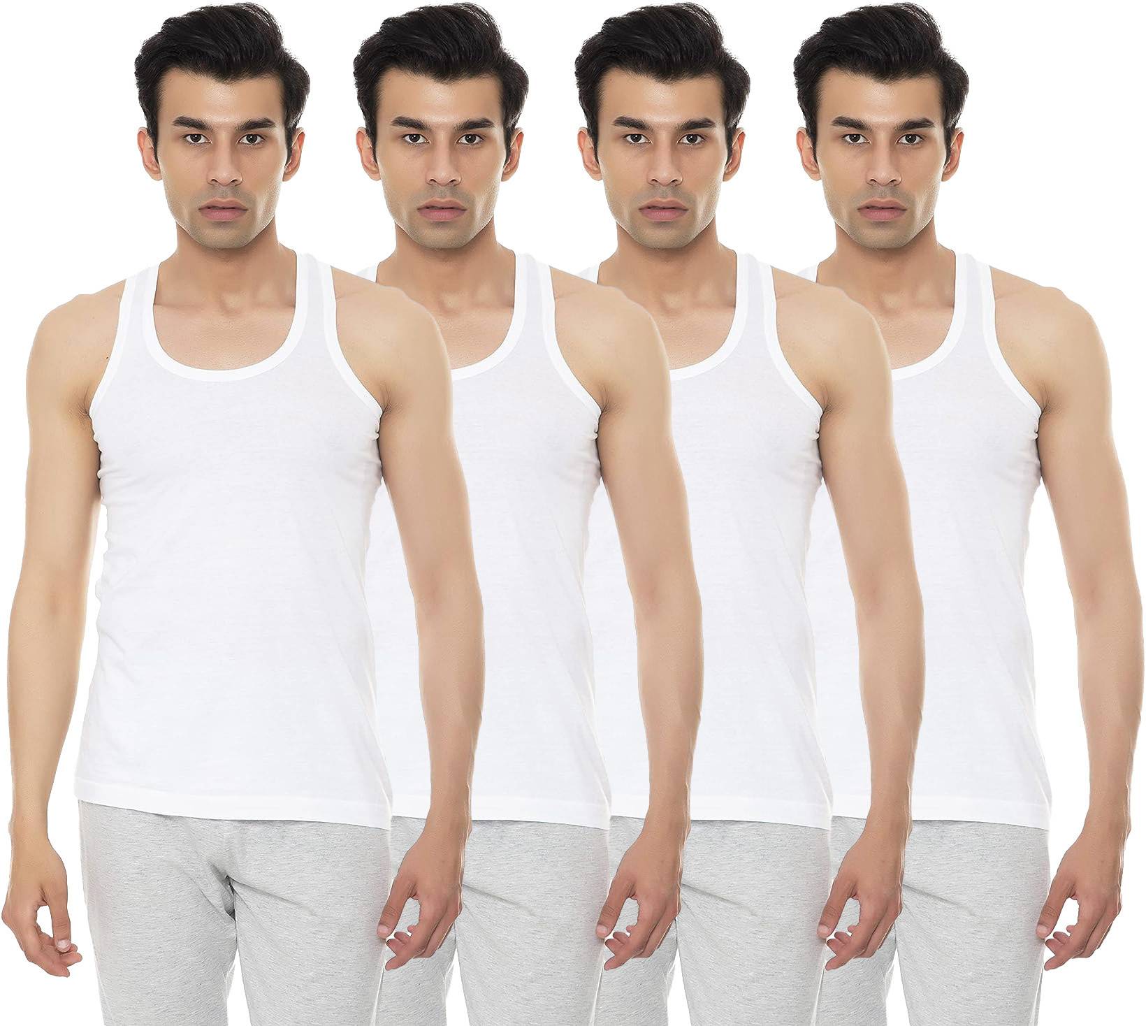 Men's Cotton White Sleeveless Vest - Pack of 4 . 100% pure cotton. Seamless body with superior comfort. Made of single jersey fabric. Ultra-soft hand feel. Tag-less branded label. Crafted from pure cotton interlock fabric, offering a luxurious and soft feel against the skin. Suitable for everyday wear or as an undershirt, adapting to different wardrobe needs. Reinforced stitching enhances longevity, promising resilience to daily wear. Timeless white hue, providing versatility for various wardrobe combinations. Snug fit for a streamlined silhouette, ensuring both comfort and style.