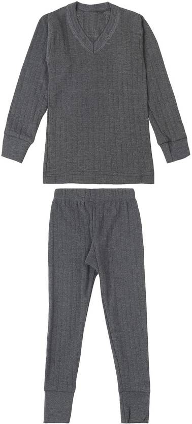 Boys & Girls Charcoal V Neck Full Sleeves Upper & Lower Thermal Set - Pack of 1. Feather Soft Fabric, Use polyester cotton fabric for a soft velvety feel. Soft Brushed inner surface that absorbs Moisture from the skin. Extremely warm- triple Insulated with polyfill wedges between two Layers of Cotton. Ultra Thin- Lightweight lean fabric with high stretch for mobility with ease. Comfort to wear- Falt seam with the tagless branded label makes them comfortable as well as smooth look. reinforcement stitch secured with bar tack for Durability. Modern Fit.