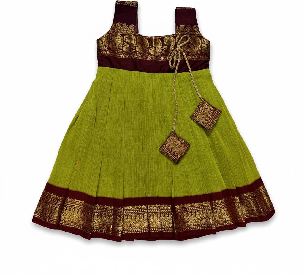 Kalyani Silk Cotton Kids Frock | Sleeveless Traditional Dress with Peacock Zari Border | Soft Fabric | Front Knot Design | Midi Length