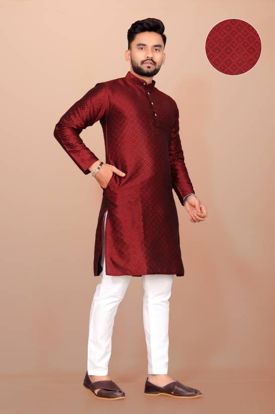 Men printed jacquard full sleeve kurta.Kurta Available Sizes are - S = 36 inches, M = 38 inches, L= 40 inches, XL= 42 inches. Sleeve length - S = 22.5 inches, M = 23 inches, L= 23.5 inches, XL= 24 inches. Kurta Length - S=28 Inches, M = 28.5 inches, L = 29.5 inches, XL= 30 inches.