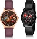 Dial Colour : Brown And Black ; Band Colour : Red And Black ; Case Shape : Round ; Band Material : Genuine Leather And Plastic ; Case Diameter : 34 And 32 mm ; GROOT Brand New Quartz Rooster Or Cock Red And Black Colour Analog Genuine Leather And Plastic Belt 2 Watch Combo For Women And Girls - GM369-(37-L-10)#