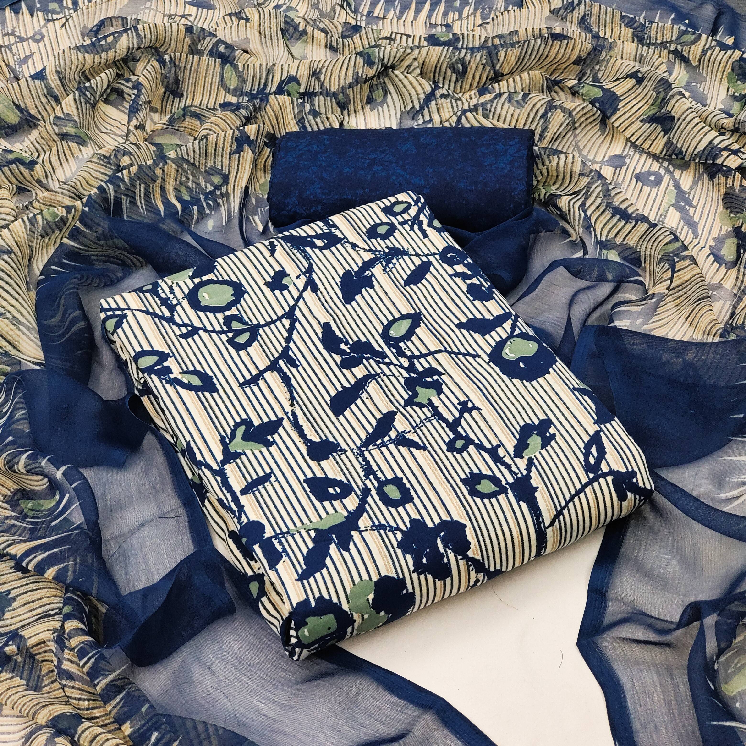 Add style to your Daily Wear Collection with this Printed Dress material. Pack Includes 1 Unstitched Salwar, 1 Unstitched Top, 1 Dupatta. Top & Bottom Fabric : American Crepe, Dupatta Fabric : Martina