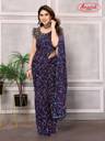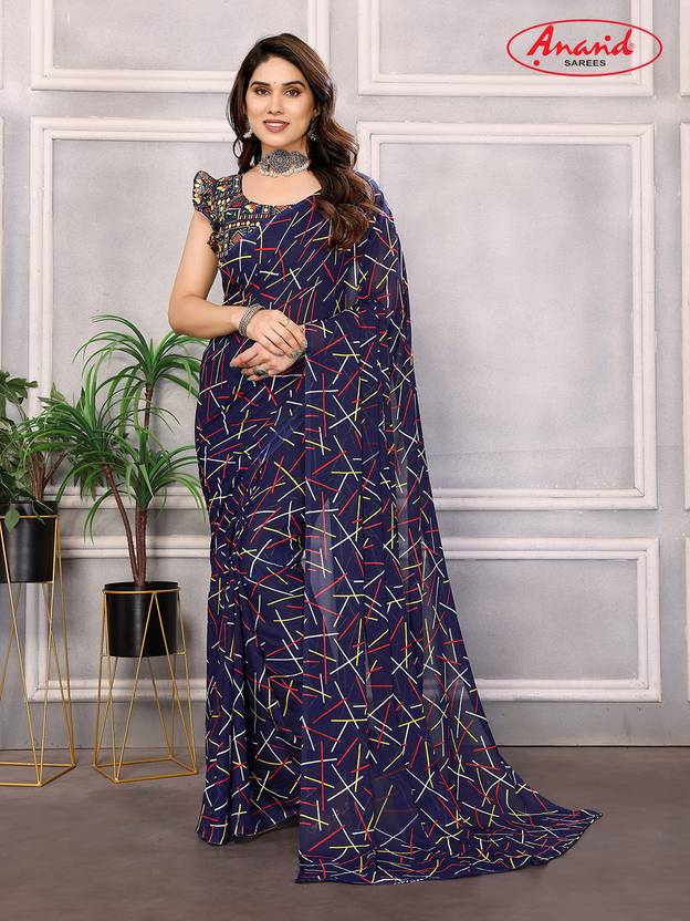 Georgette Daily Wear Dark Blue Colored Striped::Printed Party Wear Saree With Printed Un-Stitched Blouse Piece .comes along unstitched georgette blouse which you can customise as per your design/style.