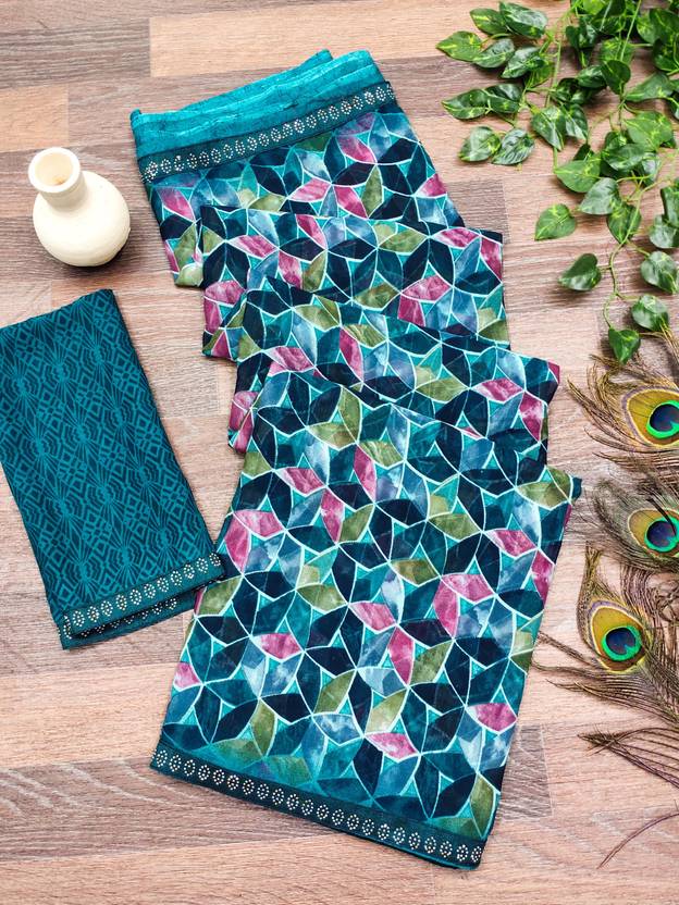 Diomond Lace Border Saree With Beautifully Printed Patterns and with Printed Un-Stitched Blouse Piece