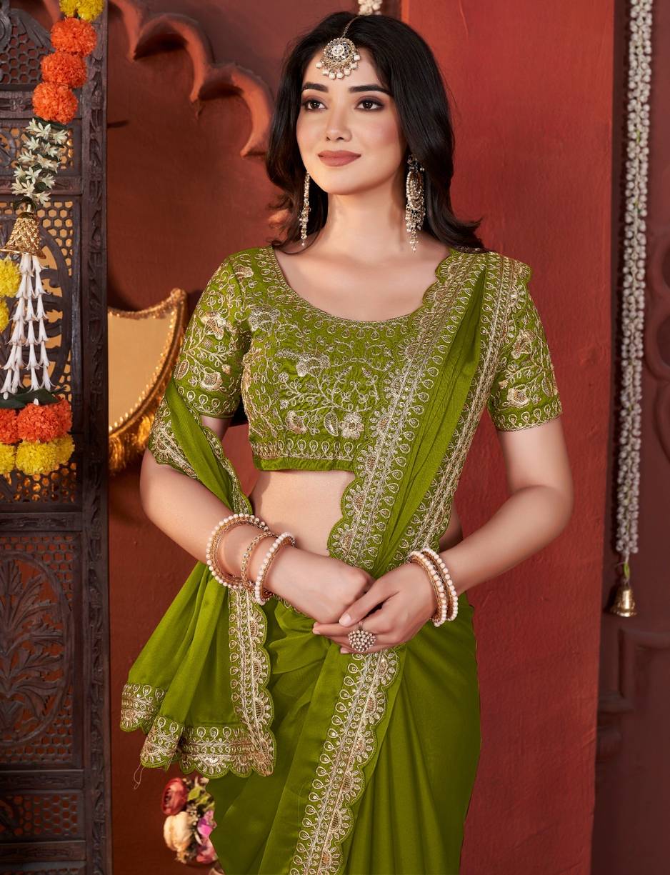 Blending traditional craftsmanship with modern glamour, this saree is a timeless addition to your festive or occasion wear collection—perfect for those who love to make a statement in refined style.