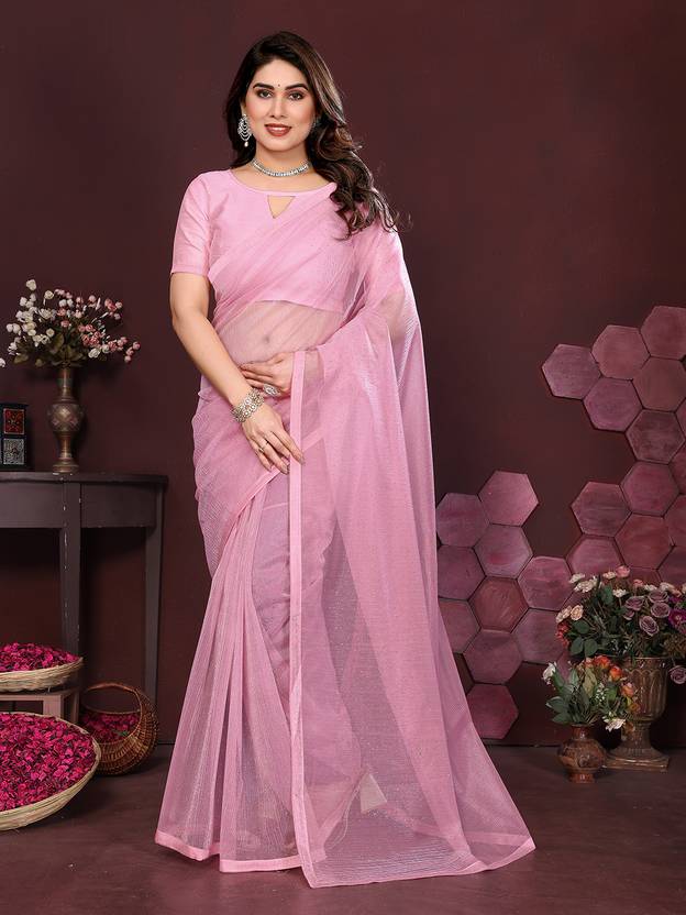 Anand Sarees Solid/Plain Bollywood Net, Lace Saree (Pink)