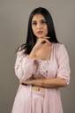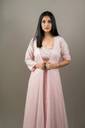 Our three-piece pink lehenga set includes a jacket with full sleeves, a sleeveless top with elastic at the waist, a crinkled flared skirt with a completely elasticated waistband. This lovely style is ideal for weddings and Navratri because it is embellished with classy sequin accents.