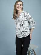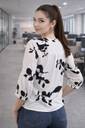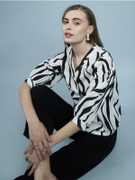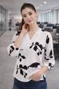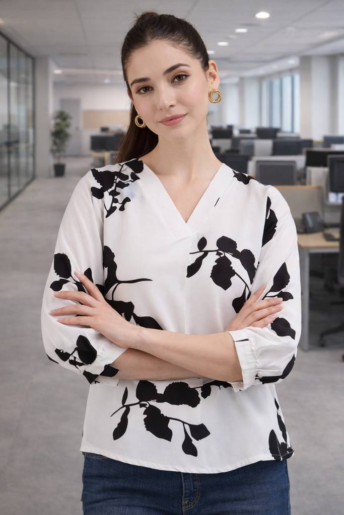 This elegant white top features a striking black floral and leaf print, offering a sophisticated yet versatile look. It is designed with a flattering V-neckline and comfortable 3/4 sleeves with elasticated cuffs, adding a touch of style. The regular fit ensures ease of movement and a comfortable wear throughout the day. This top is perfect for both casual outings and semi-formal events. Pair it with blue or black jeans for a relaxed ensemble, tailored trousers for a smart office look, or a skirt for a chic, feminine outfit. It can also be layered under a blazer or cardigan for cooler weather.