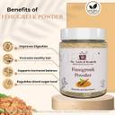 Fenugreek powder, made by grinding the seeds of the fenugreek plant, has a distinct bitter, slightly sweet flavor that is often compared to maple syrup. Fenugreek is widely used in Indian cooking, particularly in curries, dals, and spice blends like panch phoron. It is known for its robust flavor that adds richness to savory dishes and is frequently used in pickles and chutneys. Fenugreek is also famous for its medicinal properties, including its ability to aid digestion, regulate blood sugar levels, and improve lactation in nursing mothers. Additionally, fenugreek is rich in fiber, vitamins, and minerals, making it a beneficial addition to a balanced diet.
