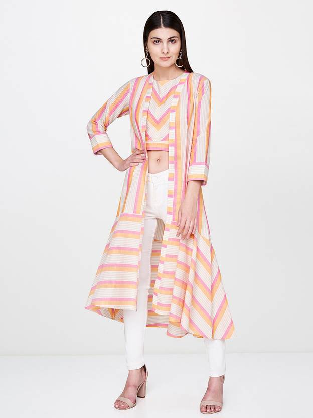 3/4th sleeve High Low Open neck Striped Casual Wear Regular Fit Shrug