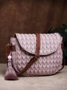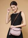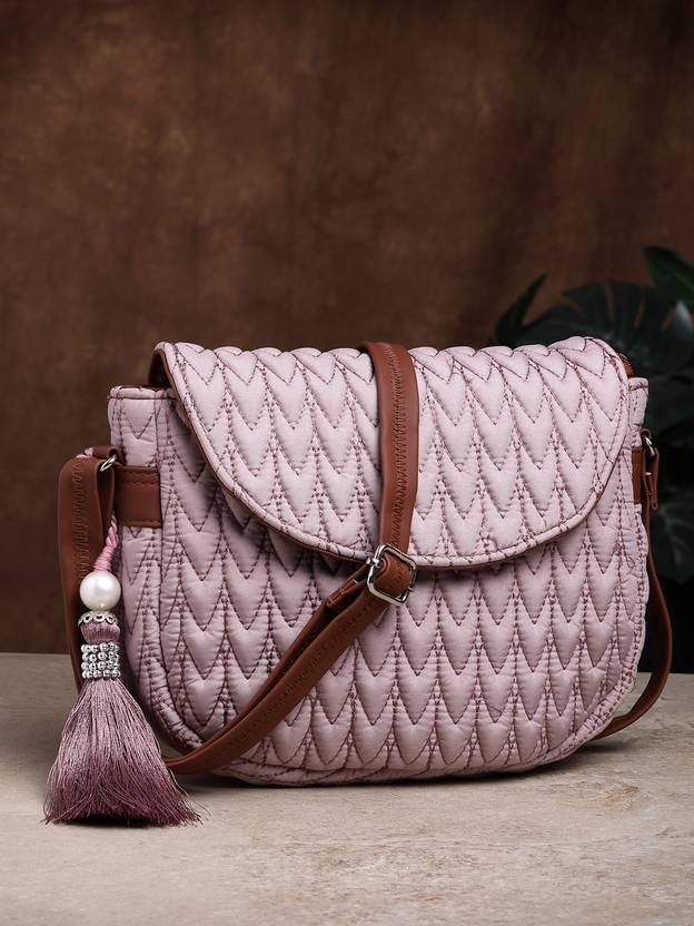 Dusty Pink & Tan Sling Bag from Anekaant's Uno Collection. Crafted with Polyester fabric, this Sling Bag features a Chevron Quilted Pattern with a matching Tassel. It has 1 main compartment secured with a Flap and a Zipper closure. It includes 1 Inner Patch Pocket and 1 External Zip Pocket. Has an Adjustable Vegan Leather Sling Strap. Dimensions (LxHxW) : 17 x 23 x 7 cm
