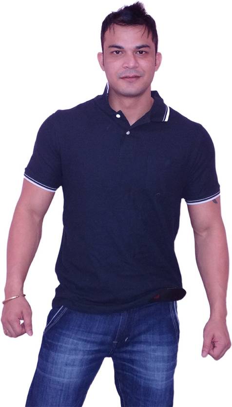 Angelo Litrico Men Solid Polo Neck Cotton Blend Black T-Shirt