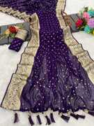 Embrace timeless elegance with this stunning red chiffon saree beautifully adorned with golden zari polka work. The saree features an intricately designed golden embroidered border that adds a regal touch to its appearance. The elegant tassels on the pallu enhance its traditional charm, making it a perfect choice for weddings, festive occasions, and parties. Paired with a matching embroidered blouse piece, this saree brings together grace, tradition, and sophistication in one masterpiece.