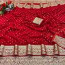 Embrace timeless elegance with this stunning red chiffon saree beautifully adorned with golden zari polka work. The saree features an intricately designed golden embroidered border that adds a regal touch to its appearance. The elegant tassels on the pallu enhance its traditional charm, making it a perfect choice for weddings, festive occasions, and parties. Paired with a matching embroidered blouse piece, this saree brings together grace, tradition, and sophistication in one masterpiece.
