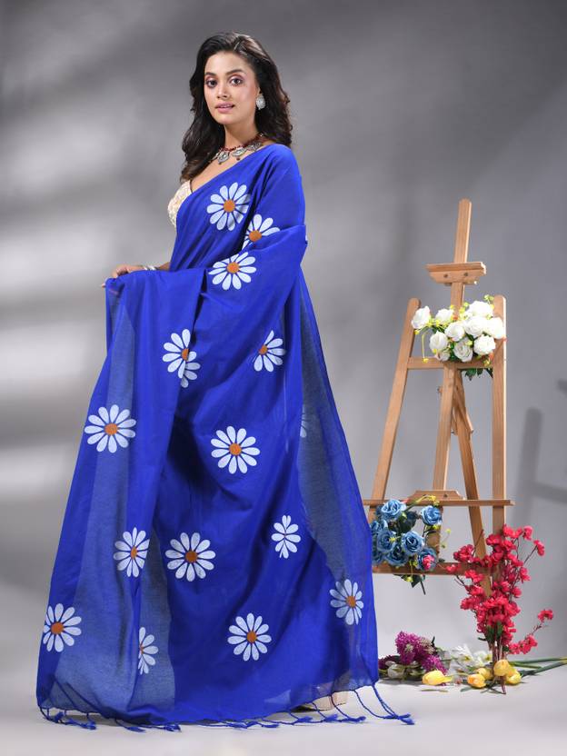 Solid/Plain Handloom Cotton Blend Saree (Blue)