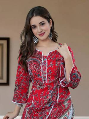 Beautiful kurti, as shown in the photo. good stitching, perfect fitting. Material is good, not transparent. Go for it.