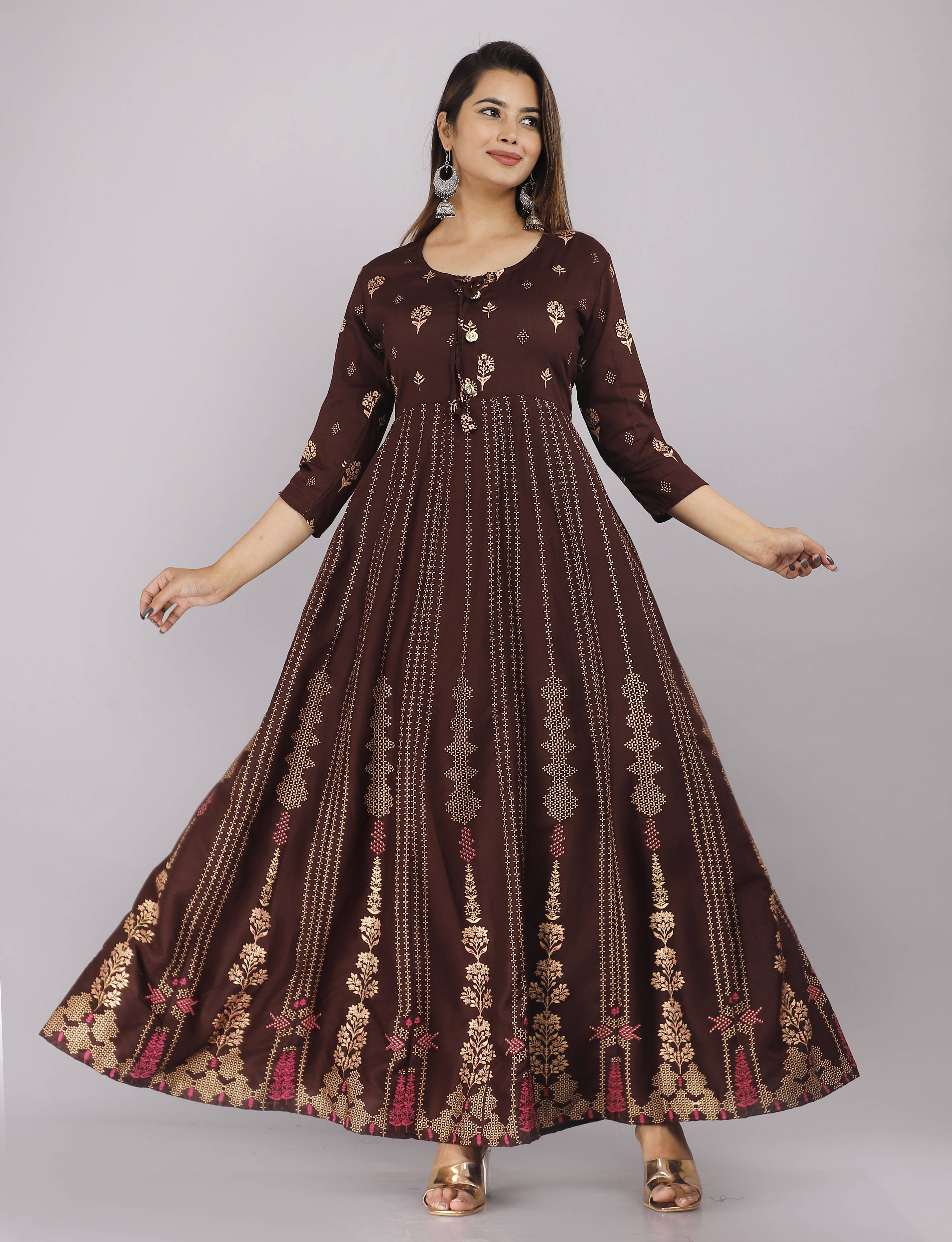 Floral Print Viscose Rayon Stitched Anarkali Gown (Brown)