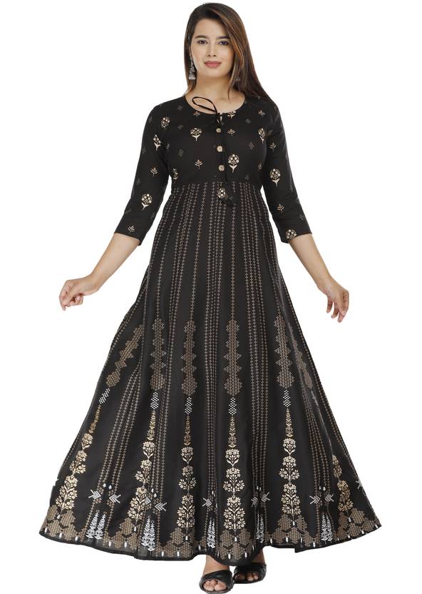 Floral Print Viscose Rayon Stitched Anarkali Gown (Black)