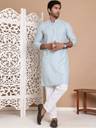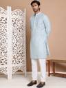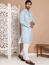 Turquoise Blue Floral Printed Kurta Pyjama Set, Turquoise Blue straight above knee kurta, has a mandarin collar, long sleeves, straight hem, 2 pockets ,White solid Pyjama, drawstring closure
