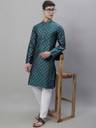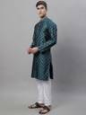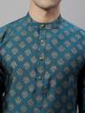 Teal and Golden Jacquard Silk Kurta with Pyjamas, Teal and Golden Straight knee length kurta, has a mandarin collar, long sleeves, Straight hem, White solid pyjamas, drawstring closure