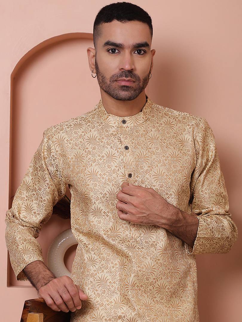 Men Printed Cotton Silk Straight Kurta (Gold)
