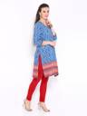 Blue and white, woven, printed kurta, contrast piping with sequin detail along V neck extending till chest, three quarter sleeves with contrast taping at cuffs, contrast print on the front and back hem, has side slits. Unique and stylish, this lovely kurta by Anouk will have you look your ethnic best. Match it with jeans or leggings and strappy sandals for a chic ethnic ensemble.