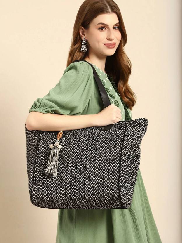 Black geometric textured tote bag 1 main compartment