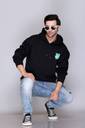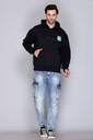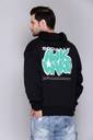 Printed black sweatshirt, has a hood, 1 kangaroo pocket, dropped shoulders, long sleeves, ribbed cuffs & hem. Soft brushed inside.