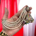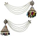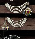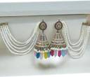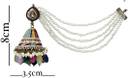 Elevate your ethnic ensemble with this exquisite pair of jhumkas (earrings) from India. Meticulously handcrafted with copper and gold plating, these ornate jhumkas boast intricate detailing and vibrant Multi-coloured beads that cascade elegantly. Measuring approximately 8cm in length and 3 to 3.5cm in width, these statement pieces are sure to turn heads. The jhumkas are strung on a lustrous pearl chain, adding a touch of regal opulence to your look. Whether adorning them for a festive occasion or a casual day out, these jhumkas will elevate your ethnic ensemble to new heights of sophistication. Please note that these jhumkas are not suitable for rough handling and should be stored with care.