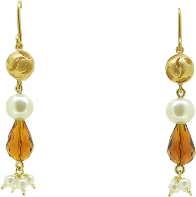 Anuanand Silver Designer Jewellery- Pretty danglers with yellow tone cut work ball, followed by pearl and deep orange coloured faceted beads with tiny pearls to finish. Length 55mm, Width 8mm.