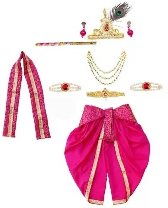Make your child the star of the celebration with this traditional Krishna dress set—a complete kids Krishna dress combo with all essential elements: crown, flute, jewelry, and vibrant dhoti kurta. It’s a great option for gifting, school functions, pujas, and photo shoots.