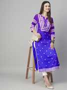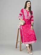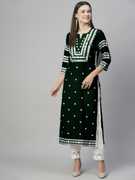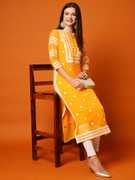 Boasting a calf-length silhouette, this straight kurta features a notched neck that adds a flattering touch. With three-quarter sleeves, this design strikes a balance between elegance and casual wear, making it adaptable for different settings. Hence, these stylish details contribute to this kurta's overall charm, allowing it to be easily paired with various bottoms.