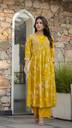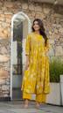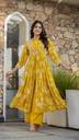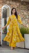 Women's Yellow Muslin 2-Piece Long Dress with Floral Print Stylish Ethnic Wear Kurta and Pants Set
