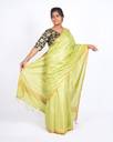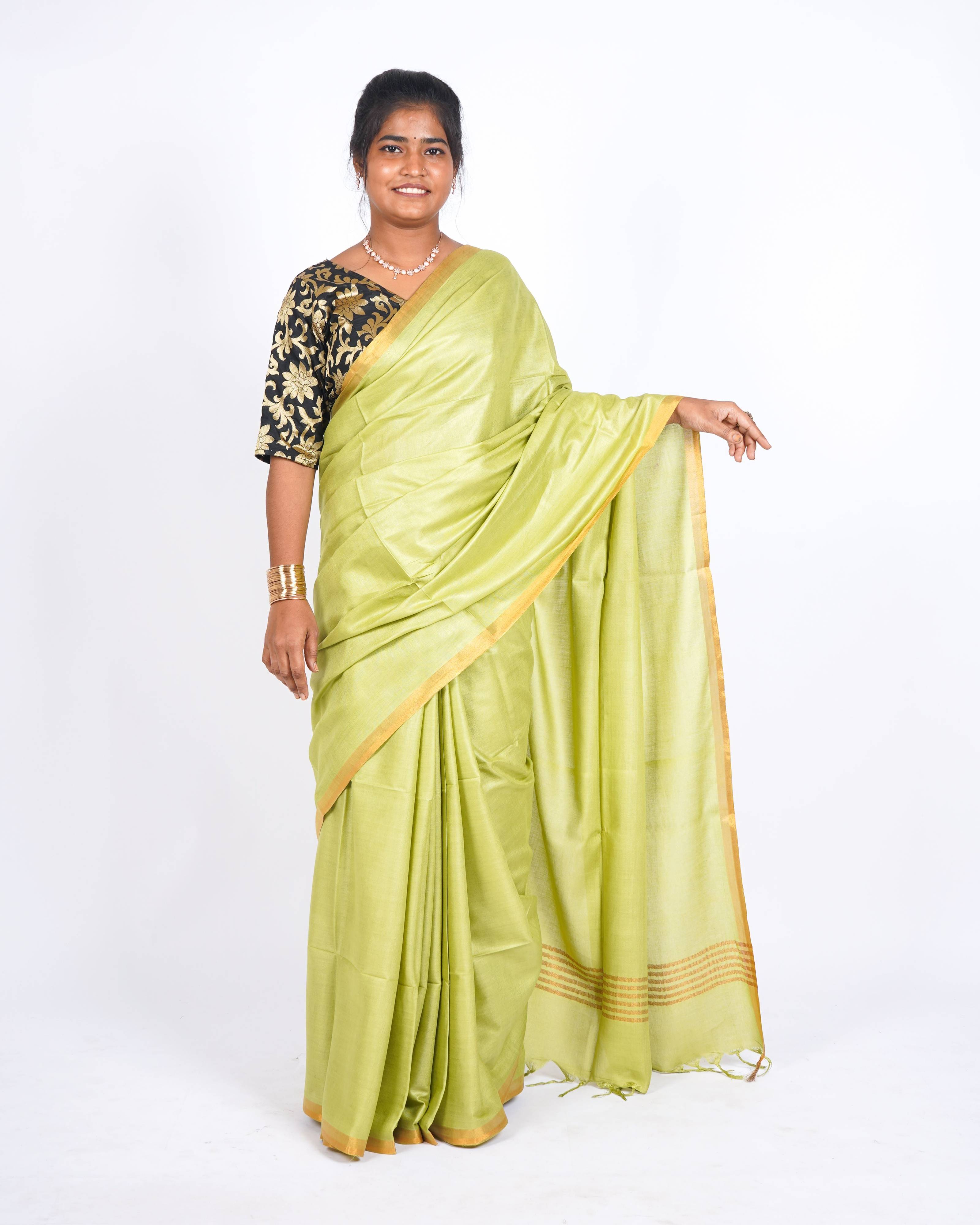 Bring a touch of elegance to your ethnic collection with this Anuttara Women’s Bhagalpuri Cotton Staple Saree in a refreshing green shade. Highlighted with frill detailing and a solid body, this saree exudes minimalistic beauty with a modern festive twist.Made from lightweight cotton staple fabric, it offers a soft texture, breathable comfort, and an elegant drape. The thin golden zari border enhances its ethnic charm, while the matching unstitched blouse piece ensures a complete traditional look. Perfect for festivals, parties, and cultural occasions, this saree is both versatile and stylish.